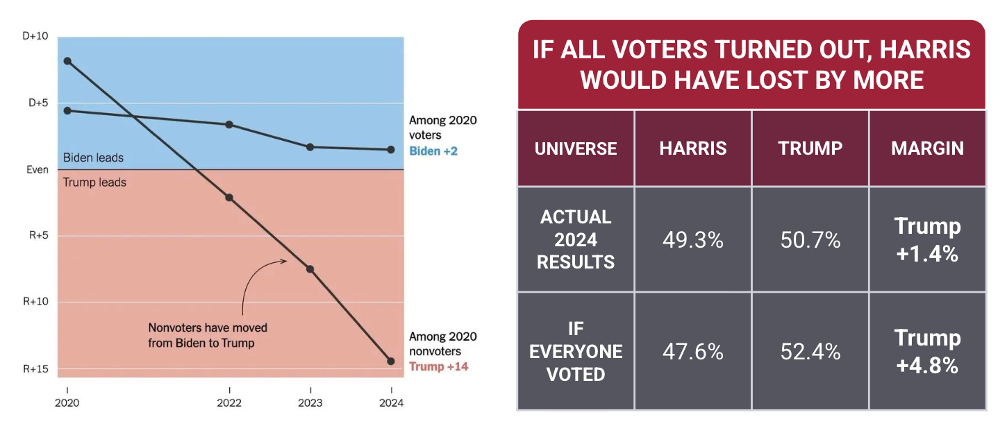 The chart on the left tells us that President Biden won in 2020 by about 4% of voters. Of the people who didn’t vote in 2020, he led by close to 8%. Flash forward four years: 2020 voters still supported the Democrat by 2%, but among those same non-voters from 2020, they supported Trump in 2024 by 14%. So the people on the couch actually leaned heavily Republican. Indeed, if all voters had turned out in 2024, Vice President Harris would have lost by even more.